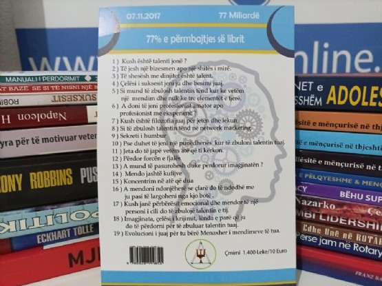 1. Cili është talenti jonë?2) Të jesh një biznesmen apo një shitës i mirë.3) Të shesësh me dinjitet është talent!4) Çelësi i suksesit jeni ju dhe besimi juaj.5) Si mund të zbulosh talentin tënd, kur ke vetëm një mendim, dhe nuk ke tre elementët e tjerë.6) Dëshironi të jeni profesionist amator apo me eksperiencë?7) Si të ngeleni fëmijë në mënyrën se si i kërkoni dhe i merrni gjërat që doni.8) Cila është filozofia juaj për jetën?9) Cila është filozofia juaj për paranë?10) Disa pyetje që duhet t’i bëni vetes për të zbuluar talentin tuaj11) Sekreti i humbur12) Pse duhet të jeni një punëdhënës kur të zbuloni talentin tuaj13) Pyetjet që do t`ju ndihmojnë për të kuptuar nëse po ndërtoni një biznes që ka të bëjë me talentin tuaj14) Ndërtoni suksesin tuaj duke ndihmuar të tjerët të arrijnë objektivat e tyre. 15) Jeta do të jap vetëm atë që ti kërkon!16) Kush janë përbërësit emocional dhe mendor të një personi i cili do të zbulojë talentin e tij.17) Imagjinata, çelësi i krijimit, lënda e parë që ju do të përdorni për të zbuluar talentin tuaj.18) Fjalët magjike që do t`ju ndryshojnë jetën pa kosto.19) Përdor forcën e fjalës20) Koncentrim në atë që dua 21) Mendo jashtë kufijve- Autori: Muhamet Bizhga