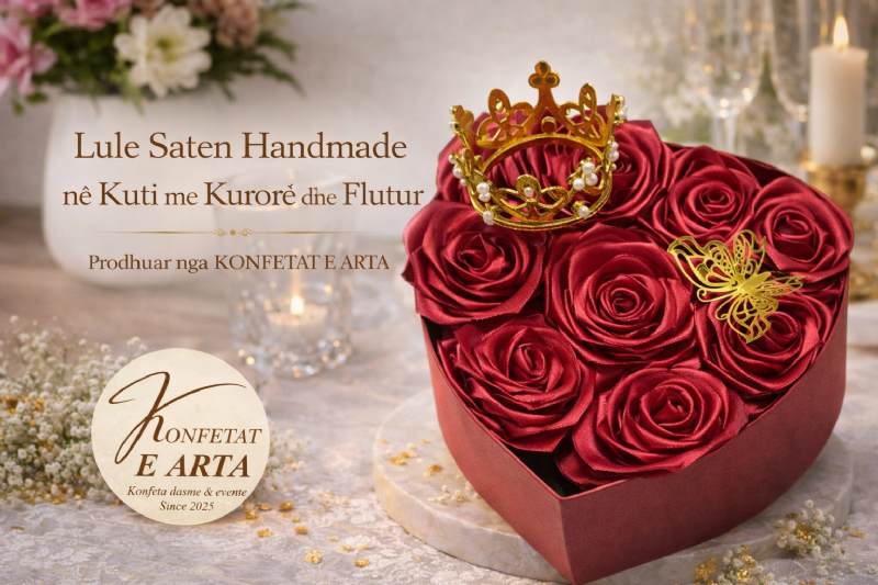 Emri i produktit: Lule Saten Handmade në Kuti me Kurorë dhe Flutur nga KONFETAT E ARTA, kuti me lule saten handmade, dhuratë me lule saten, lule artificiale saten, dhuratë romantike, dekor me lule në kuti, dhuratë e personalizuar me lule dekorative